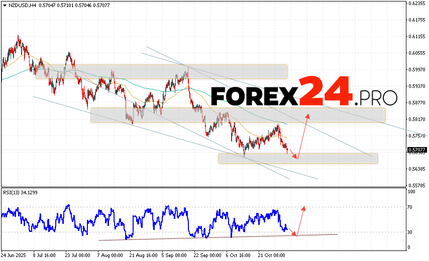 NZD/USD Forecast and Analysis for November 4, 2025 suggests an attempt to test the support area near 0.5685. From there, we should expect continued price growth above 0.5825. A rebound from the support line on the relative strength indicator (RSI) would be an additional signal in favor of an uptrend. A price decline and a breakout of 0.5625 would cancel out the NZD/USD pair’s downward trend. In this case, we should expect continued decline with a potential target below 0.5375.