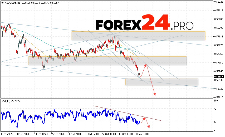 NZD/USD Forecast and Analysis for November 6, 2025suggests an attempt to test the resistance area near 0.5675. From there, we should expect a continued decline below 0.5585. A rebound from the resistance line on the relative strength indicator (RSI) would be an additional signal for a decline. A strong price increase and a breakout of 0.5735 would cancel the NZD/USD downside scenario. In this case, we should expect continued growth with a potential target above 0.5905.