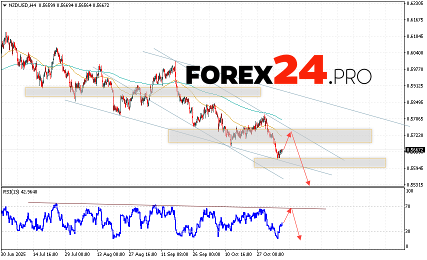 NZD/USD Forecast and Analysis for November 7, 2025 suggests an attempt to test the resistance area near 0.5725. From there, we should expect a continued decline below 0.5545. A rebound from the resistance line on the relative strength indicator (RSI) would be an additional signal of decline. A strong price increase and a breakout of 0.5785 would cancel out the NZD/USD pair’s downward trend. In this case, we should expect continued growth with a potential target above 0.5975.
