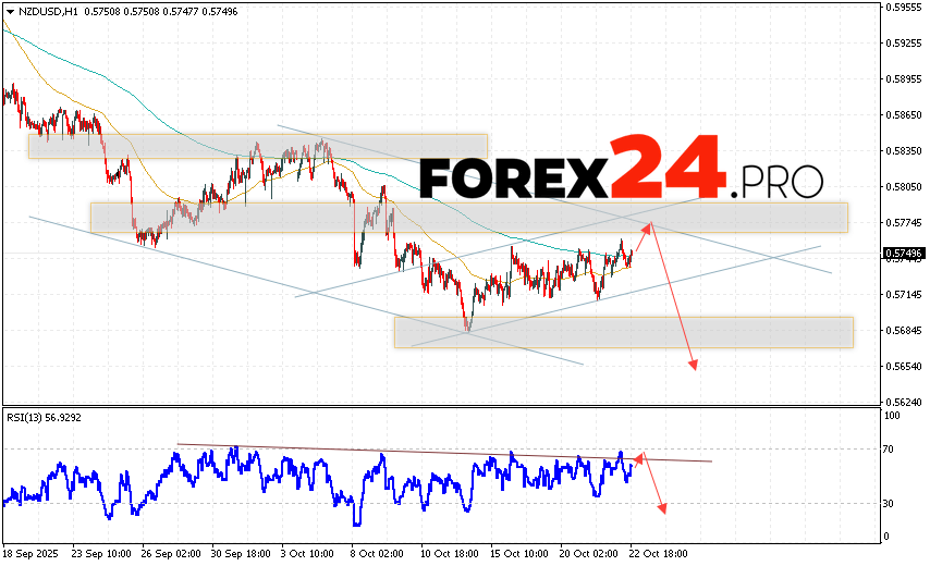 NZD/USD Forecast and Analysis for October 23, 2025 suggests an attempt to test the resistance area near 0.5765. From there, we should expect a continued decline below 0.5665. A rebound from the resistance line on the relative strength indicator (RSI) would be an additional signal of decline. A strong price increase and a breakout of 0.5805 would cancel the NZD/USD pair’s downward trend. In this case, we should expect continued growth with a potential target above 0.5945.