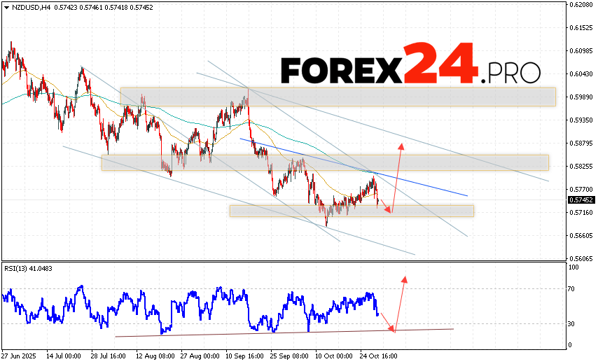 NZD/USD Forecast and Analysis for October 31, 2025 suggests an attempt to test the support area near 0.5715. From there, we should expect continued growth above 0.5885. A rebound from the support line on the relative strength indicator (RSI) would be an additional signal in favor of an uptrend. A decline in the NZD/USD pair would be canceled if the price fell and broke below 0.5675. In this case, we should expect continued decline with a potential target below 0.5485.