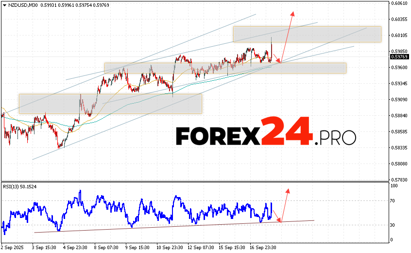 NZD/USD Forecast and Analysis for September 18, 2025 suggests an attempt to test the support area near 0.5965. From there, we should expect continued price growth above 0.6045. A rebound from the support line on the relative strength indicator (RSI) would be an additional signal in favor of an uptrend. A price decline and a breakout of 0.5925 would cancel out the NZD/USD pair’s upward trend. In this case, we should expect continued declines with a potential target below 0.5675.