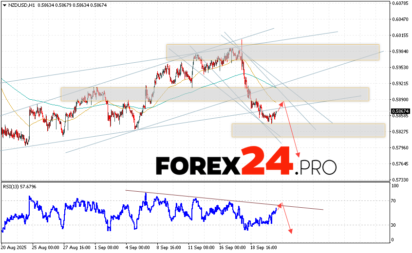 NZD/USD Forecast and Analysis for September 24, 2025 suggests an attempt to test the resistance area near 0.5895. From there, we should expect a continued decline in quotes below 0.5755. A rebound from the resistance line on the relative strength indicator (RSI) would be an additional signal of decline. A strong price increase and a breakout of 0.5945 would cancel the NZD/USD pair’s downward trend. In this case, we should expect continued growth with a potential target above 0.6075.