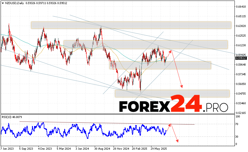 NZD/USD Weekly Forecast August 11 — 15, 2025 suggests an attempt to develop a bullish correction and test the resistance level near the 0.6005 area. Further, the NZD/USD pair will continue to fall to the area below the 0.5575 level. An additional signal in favor of a decline will be a test of the trend line on the relative strength indicator. A strong rise in the NZD/USD closing price above the 0.6165 level will cancel the decline scenario. In this case, we can expect the currency pair to continue rising with a target above the 0.6375 level.