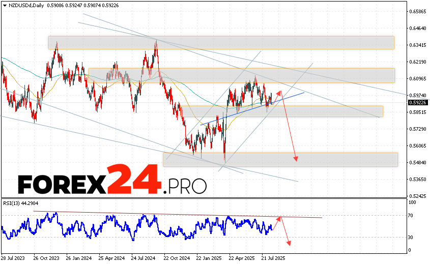 NZD/USD Weekly Forecast August 18 — 22, 2025 suggests an attempt to develop a bullish correction and test the resistance level near the 0.5975 area. Further, the NZD/USD pair will continue to fall to the area below the 0.5485 level. An additional signal in favor of a decline will be a test of the trend line on the relative strength indicator. A strong rise in the NZD/USD closing price above the 0.6165 level will cancel the decline scenario. In this case, we can expect the currency pair to continue rising with a target above the 0.6375 level.