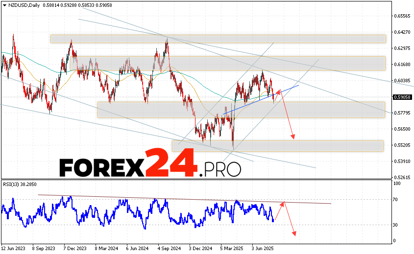 NZD/USD Weekly Forecast August 4 — 8, 2025 suggests an attempt to develop a bullish correction and test the resistance level near the 0.6025 area. Further, the NZD/USD pair will continue to fall to an area below the 0.5545 level. An additional signal in favor of a decline will be a test of the trend line on the relative strength indicator. A strong rise in NZD/USD quotes above the level of 0.6205 will cancel the decline scenario. In this case, we can expect the currency pair to continue rising with a target above the level of 0.6485.
