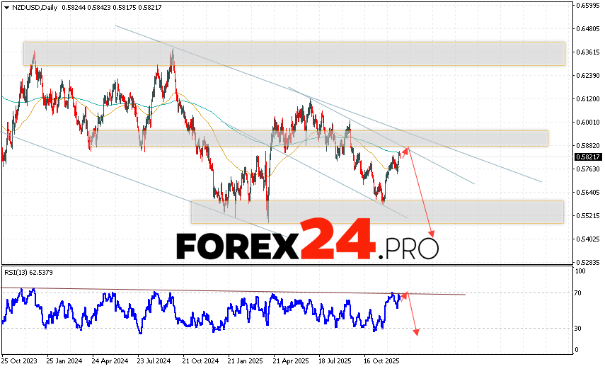 NZD/USD Weekly Forecast December 29, 2025 — January 2, 2026 suggests an attempt at a bullish correction and a test of resistance near 0.5845. Subsequently, the NZD/USD pair is expected to continue to decline below 0.5425. A test of the trendline on the relative strength indicator (RSI) would be an additional signal of decline. A strong close above 0.6065 would cancel out the pair’s downward trend. In this case, we should expect continued upward movement of the currency pair with a target above 0.6285.