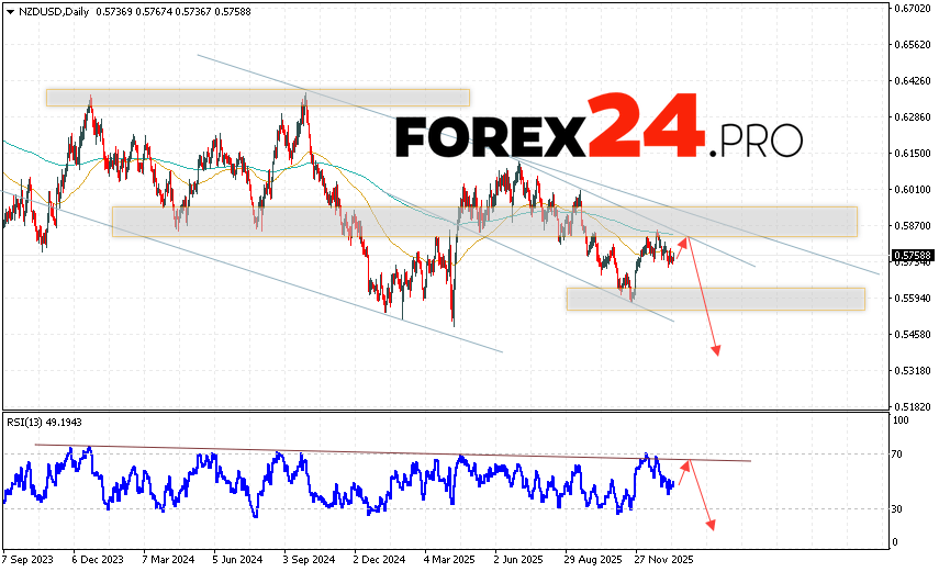 NZD/USD Weekly Forecast January 19 – 23, 2026 suggests an attempt to develop a bullish correction and test resistance near the 0.5805 level. Subsequently, the NZD/USD pair is expected to continue to decline below 0.5385. A test of the trendline on the relative strength indicator (RSI) will serve as an additional signal for a decline. A strong close above 0.6005 would cancel out the pair’s downward trend. In this case, we should expect continued upward movement of the currency pair with a target above 0.6235.