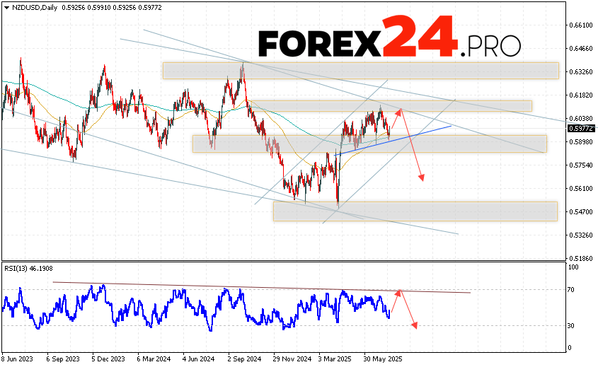 NZD/USD Weekly Forecast July 21 — 25, 2025 suggests an attempt to develop a bullish correction and test the resistance level near the 0.6055 area. Further, the NZD/USD pair will continue to fall to the area below the 0.5625 level. An additional signal in favor of a decline will be a test of the trend line on the relative strength indicator. A strong rise in the NZD/USD closing price above the 0.6245 level will cancel the decline scenario. In this case, we can expect the currency pair to continue rising with a target above the 0.6475 level.