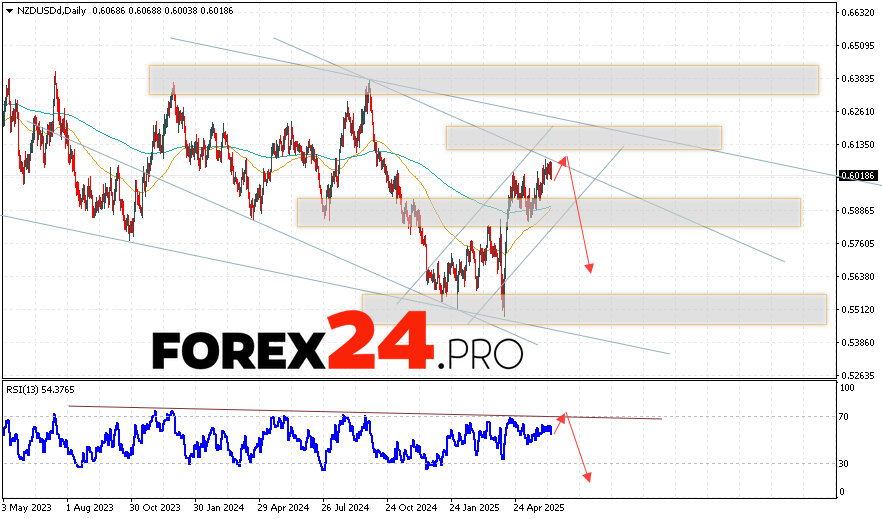 NZDUSD Weekly Forecast June 16 — 20, 2025 suggests an attempt to develop a bullish correction and test the resistance level near the 0.6085 area. Further, the NZD/USD pair will continue to fall to the area below the 0.5635 level. An additional signal in favor of a decline will be a test of the trend line on the relative strength indicator. A strong rise in the NZD/USD closing price above the 0.6205 level will cancel the decline scenario. In this case, we can expect the currency pair to continue rising with a target above the 0.6475 level.