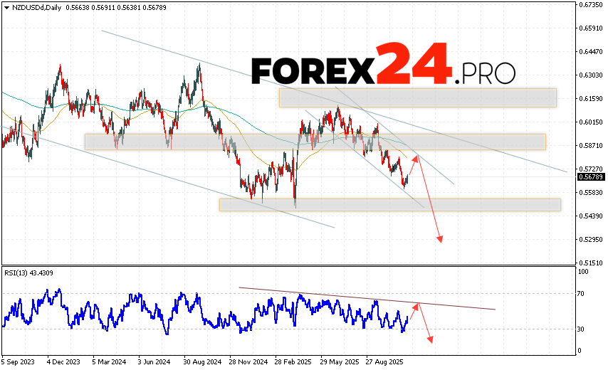 NZD/USD Weekly Forecast November 17 – 21, 2025 suggests an attempt to develop a bullish correction and test resistance near 0.5745. Subsequently, the NZD/USD pair is expected to continue to decline below 0.5285. A test of the trendline on the relative strength indicator (RSI) would be an additional signal of decline. A strong close above 0.6045 would cancel out the pair’s downward trend. In this case, we should expect continued upward movement of the currency pair with a target above 0.6375.