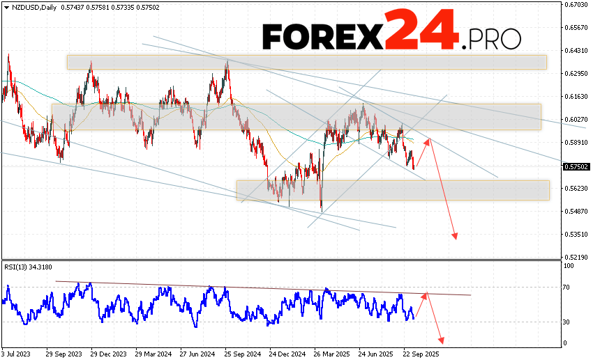 NZD/USD Weekly Forecast October 13 – 17, 2025 suggests an attempt to develop a bullish correction and test resistance near 0.5885. Subsequently, the NZD/USD pair is expected to continue to decline below 0.5365. A test of the trendline on the relative strength indicator (RSI) will serve as an additional signal for a decline. A strong close above 0.6075 would cancel out the pair’s downward trend. In this case, we should expect continued upward movement of the currency pair with a target above 0.6385.