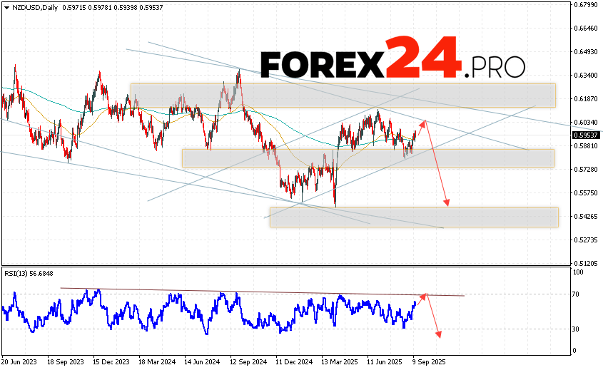 NZD/USD Weekly Forecast September 15 – 19, 2025 suggests an attempt to develop a bullish correction and test the resistance level near the area of 0.6035. Further, the NZD/USD pair will continue to fall to the area below the level of 0.5545. An additional signal in favor of a decline will be a test of the trend line on the relative strength indicator. The cancellation of the pair’s fall option will be a strong growth of NZD/USD quotes closing above the level of 0.6205. In this case, we should expect a continuation of the rise of the currency pair with a target above the level of 0.6435.