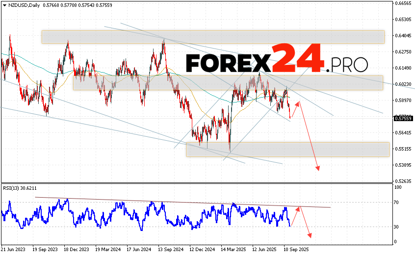 NZD/USD Weekly Forecast September 29 — October 3, 2025 suggests an attempt to develop a bullish correction and test resistance near 0.5895. Subsequently, the NZD/USD pair is expected to continue to decline below 0.5385. A test of the trendline on the relative strength indicator (RSI) would be an additional signal of decline. A strong close above 0.6045 would cancel out the pair’s downward trend. In this case, we should expect continued upward movement of the currency pair with a target above 0.6385.