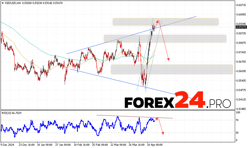 NZDUSD Forecast and Analysis for April 17, 2025 suggests an attempt to test the resistance area near the level of 0.5965. From where we should expect a continuation of the fall in quotes to the area below the level of 0.5675. An additional signal in favor of the decline will be a test of the resistance line on the relative strength indicator. The cancellation of the option of falling of the NZD/USD pair will be a strong price growth and a breakout of the level of 0.6005. In this case, we should expect a continuation of the rise of the pair with a potential target above the level of 0.6225.