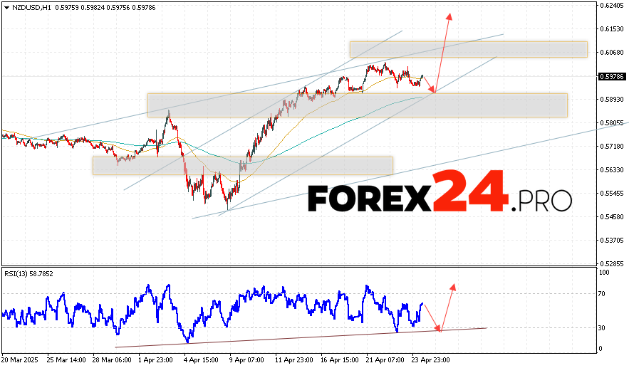 NZDUSD Forecast and Analysis for April 25, 2025 suggests an attempt to test the support area near the 0.5895 level. From where we should expect continued growth of quotes to the area above the 0.6185 level. An additional signal in favor of the rise will be a test of the support line on the relative strength indicator. The cancellation of the growth option for the NZD/USD pair will be a price drop and a breakout of the 0.5845 level. In this case, we should expect the pair to continue to decline with a potential target below 0.5635.