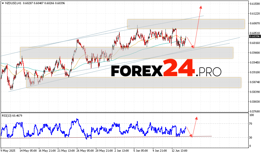 NZD/USD Forecast and Analysis for June 17, 2025suggests an attempt to test the support area near the 0.5995 level. From there, we can expect quotes to continue rising to an area above the 0.6155 level. An additional signal in favor of an increase will be a rebound from the support line on the relative strength indicator. A fall in price and a breakout of the 0.5945 level will cancel the growth scenario for the NZD/USD pair. In this case, we should expect the pair to continue falling with a potential target below the 0.5725 level.