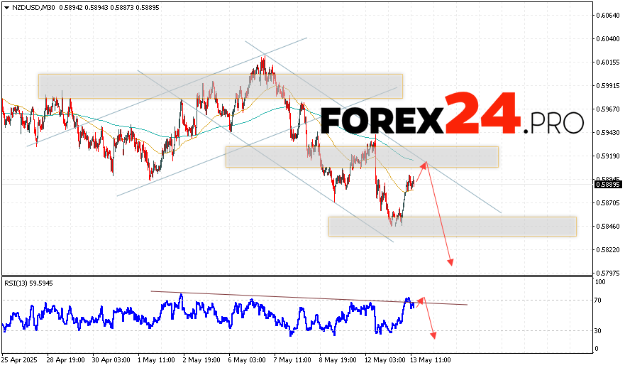 NZDUSD Forecast and Analysis for May 14, 2025 suggests an attempt to test the resistance area near the level of 0.5915. From where it is necessary to expect the continuation of quotes’ fall to the area below the level of 0.5805. An additional signal in favor of the decline will be a test of the resistance line on the relative strength indicator. A strong price growth and breakdown of 0.5965 level will cancel the NZD/USD downside option. In this case, we should expect the continuation of the pair’s rise with a potential target above the level of 0.6255.