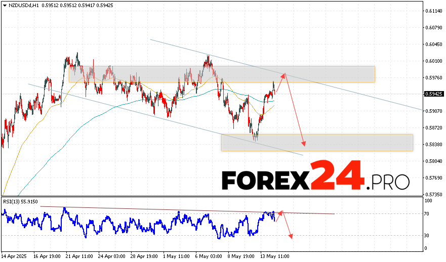 NZDUSD Forecast and Analysis for May 15, 2025 suggests an attempt to test the resistance area near the level of 0.5985. From where we should expect the quotes to continue falling to the area below the level of 0.5835. An additional signal in favor of the decline will be a test of the resistance line on the relative strength indicator. A strong price growth and breakdown of 0.6035 level will cancel the NZD/USD downside option. In this case, we should expect the continuation of the pair’s rise with a potential target above the level of 0.6275.