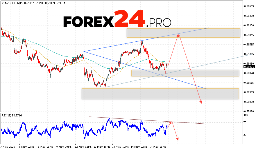 NZDUSD Forecast and Analysis for May 16, 2025 anticipates a test of the resistance zone near the level of 0.5985. A continuation of the price drop towards an area below the level of 0.5785 can be expected from this. An additional signal in favor of decline would be a test of the resistance line on the Relative Strength Index (RSI) indicator. A rejection of the downward movement option for the NZD/USD pair will be a strong price increase and a breakout above level 0.6035. In this case, one should anticipate further elevation in the currency pair with a potential target above the level of 0.6245.