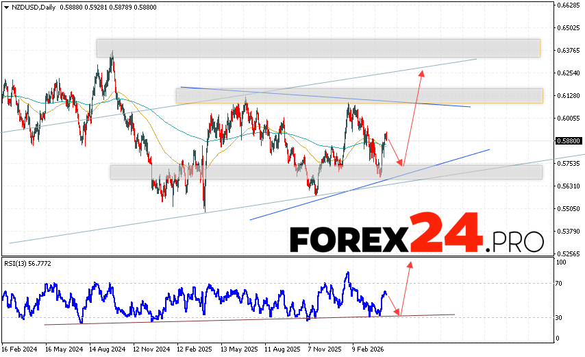 NZDUSD Weekly Forecast April 20 – 24, 2026 suggests an attempt to develop a bearish correction and test support near 0.5745. Subsequently, the NZD/USD pair is expected to continue rising above 0.6275. A test of the trendline on the relative strength indicator (RSI) will serve as an additional signal for an upside move. A decline and close below 0.5575 would cancel out the pair’s upward trend. In this case, we should expect continued declines in the currency pair with a target below 0.5275.