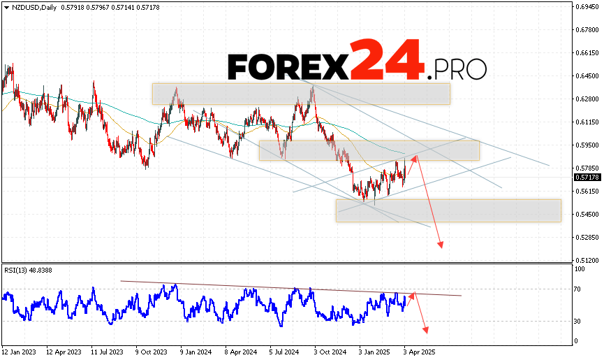 NZD/USD Weekly Forecast April 7 — 11, 2025 suggests an attempt to develop a bullish correction and test the resistance level near the 0.5795 area. Further, the continuation of the fall of the NZD/USD pair to the area below the 0.5255 level. An additional signal in favor of the decline will be a test of the trend line on the relative strength indicator. The cancellation of the fall option for the pair will be a strong growth of closing of NZD/USD quotes above the 0.5995 level. In this case, we should expect a continuation of the rise of the currency pair with a target above the 0.6275 level.
