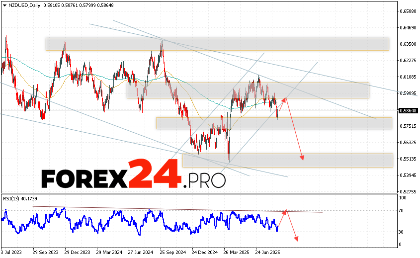 NZDUSD Weekly Forecast August 25 — 29, 2025 suggests an attempt to develop a bullish correction and test the resistance level near the area of 0.5965. Further, the NZD/USD pair will continue to fall to the area below the level of 0.5525. An additional signal in favor of a decline will be a test of the trend line on the relative strength indicator. The cancellation of the pair’s fall option will be a strong growth of NZD/USD quotes closing above the level of 0.6165. In this case, we should expect a continuation of the rise of the currency pair with a target above the level of 0.6375.