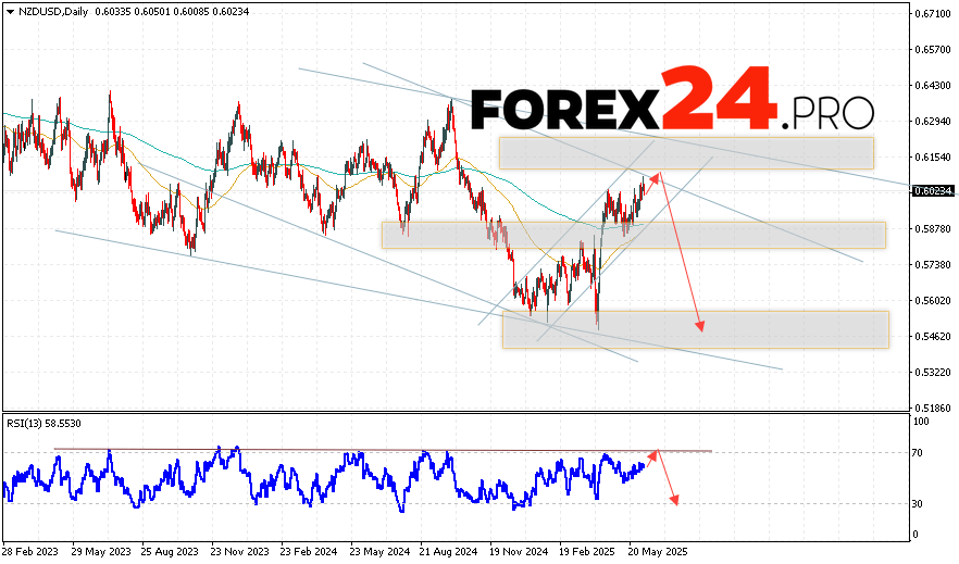 NZD/USD Weekly Forecast June 9 — 13, 2025 suggests an attempt to develop a bullish correction and test the resistance level near the 0.6075 area. Further, the NZD/USD pair will continue to fall to the area below the 0.5465 level. An additional signal in favor of a decline will be a test of the trend line on the relative strength indicator. A strong rise in the NZD/USD closing price above the 0.6195 level will cancel the decline scenario. In this case, we can expect the currency pair to continue rising with a target above the 0.6465 level.