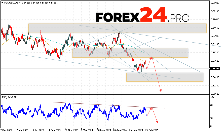 NZD/USD Weekly Forecast March 3 — 7, 2025 suggests an attempt to develop a bullish correction and test the resistance level near the 0.5775 area. Further, the continuation of the fall of the NZD/USD pair to the area below the 0.5235 level. An additional signal in favor of the decline will be a test of the trend line on the relative strength indicator. The cancellation of the fall option for the pair will be a strong growth of closing of NZD/USD quotes above the 0.5955 level. In this case, we should expect a continuation of the rise of the currency pair with a target above the 0.6185 level.