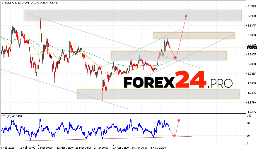 Cryptocurrency XRP Forecast for May 16, 2025 suggests a test of the support level near the area of 2.3205. From there, it’s expected that cryptocurrency growth will continue with a potential target at the level of 2.9655. An additional signal in favor of the XRP price rise would be testing the support line on the Relative Strength Index indicator. Cancellation of the option for price increase is a fall and break below the area of 2.1665. In this case, it’s advisable to expect continued depreciation of the digital currency with a target below 2.0705.