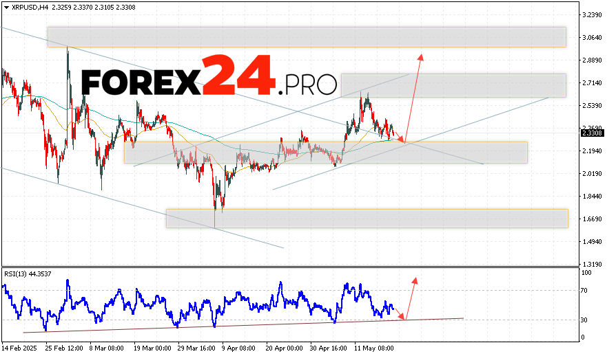 Cryptocurrency XRP Forecast for May 21, 2025 predicts a test of the support level near the area of 2.2005. From which one should expect continuation of the growth of the cryptocurrency with a potential target at the level of 2.8805. An additional signal in favor of increasing XRP quotes will be a test of the support line on the Relative Strength Index indicator. Cancellation of the option for the rise in quotes will be a drop and breaking through the area of 2.1665. In this case, one should expect further depreciation of the digital currency with a target below 2.0505.