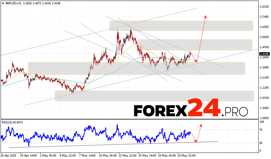Cryptocurrency XRP forecast for May 23, 2025 predicts a test of the support level near the area of 2.3205. From where one should expect the continuation of the cryptocurrency growth with a potential target at the level of 2.7465. Additional bullish signal will be the testing of the support line on the Relative Strength Index indicator. Cancellation of the option for price rise will be a drop and breaking through the area of 2.2205. In this case, one should anticipate further decline in the digital currency with a target below 2.1065.