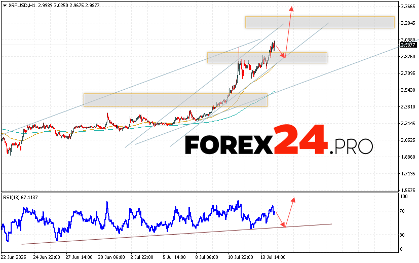 XRP cryptocurrency forecast for July 15, 2025 suggests an attempt to test the support level near the 2.8665 area. From there, we can expect the cryptocurrency to continue growing with a potential target of 3.3505. An additional signal in favor of an increase in XRP quotes will be a test of the support line on the relative strength indicator. A fall and breakout of the 2.7055 area will cancel the growth scenario. In this case, we can expect the digital currency to continue falling with a target below 2.4505.