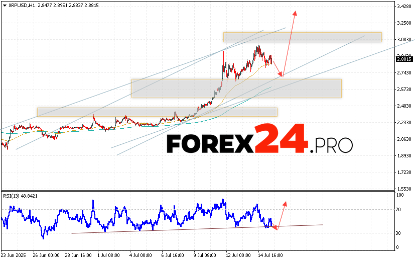 XRP cryptocurrency forecast for July 16, 2025 suggests an attempt to test the support level near the 2.7305 area. From there, we can expect the cryptocurrency to continue growing with a potential target at 3.3505. An additional signal in favor of an increase in XRP quotes will be a test of the support line on the relative strength indicator. A fall and breakout of the 2.5505 area will cancel the growth scenario. In this case, we should expect the digital currency to continue falling with a target below 2.4505.
