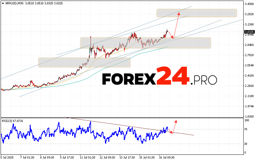XRP cryptocurrency forecast for July 18, 2025 suggests an attempt to test the support level near the 2.8665 area. From there, we can expect the cryptocurrency to continue growing with a potential target of 3.3005. An additional signal in favor of an increase in XRP quotes will be a test of the support line on the relative strength indicator. A fall and breakout of the 2.6505 area will cancel the growth scenario. In this case, we should expect the digital currency to continue falling with a target below 2.4575.