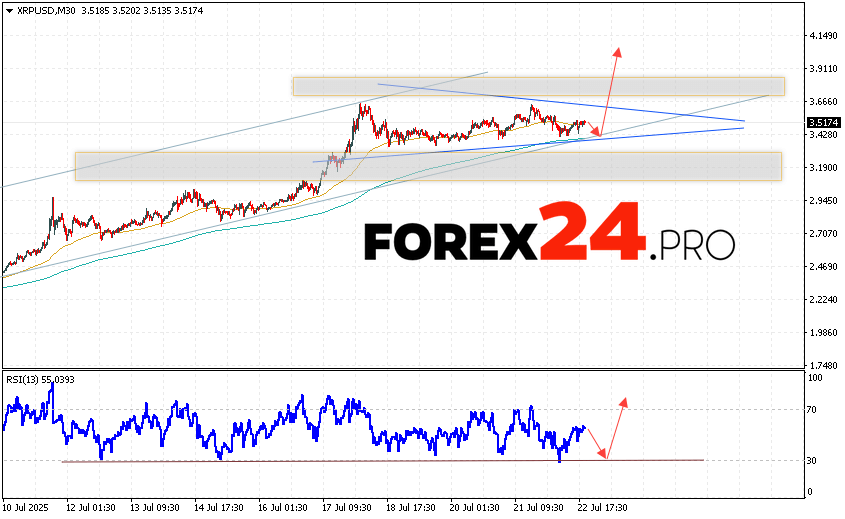 XRP cryptocurrency forecast for July 23, 2025 suggests an attempt to test the support level near the 3.4205 area. From there, we can expect the cryptocurrency to continue growing with a potential target of 3.9565. An additional signal in favor of an increase in XRP quotes will be a test of the support line on the relative strength indicator. A fall and breakout of the 3.1665 area will cancel the growth scenario. In this case, we can expect the digital currency to continue falling with a target below 2.9505.
