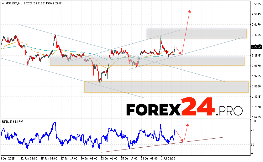 XRP cryptocurrency forecast for July 3, 2025 suggests an attempt to test the support level near the 2.1605 area. From there, we can expect the cryptocurrency to continue growing with a potential target of 2.5005. An additional signal in favor of an increase in XRP quotes will be a test of the support line on the relative strength indicator. A fall and breakout of the 2.1005 area will cancel the growth scenario. In this case, we can expect the digital currency to continue falling with a target below 1.9505.
