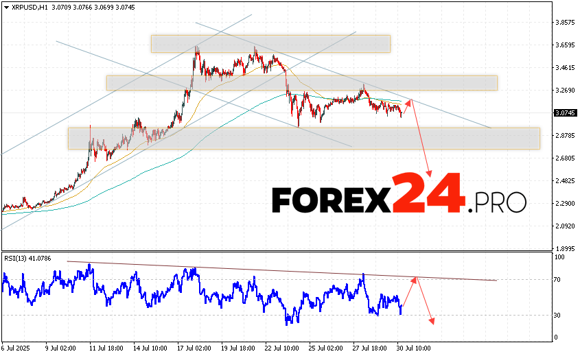 XRP cryptocurrency forecast for July 31, 2025 suggests an attempt to test the resistance level near the 3.1065 area. From there, we can expect the cryptocurrency to continue falling with a potential target of 2.4885. An additional signal in favor of a decline in XRP quotes will be a test of the resistance line on the relative strength indicator. A strong growth and a breakout of the 3.3505 area will cancel the decline scenario. In this case, we should expect the digital currency to continue rising with a target above 3.7505.