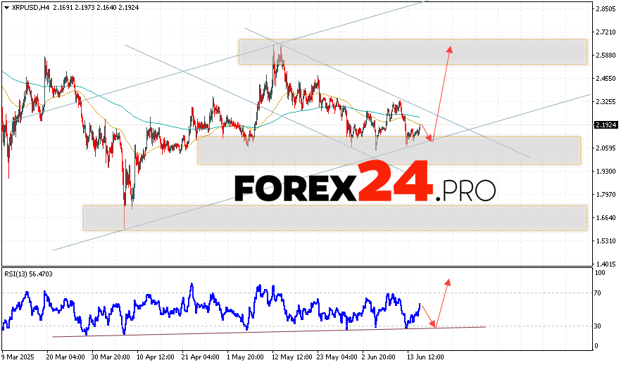 XRP cryptocurrency forecast for June 17, 2025suggests an attempt to test the support level near the 2.0765 area. From there, we can expect the cryptocurrency to continue growing with a potential target at 2.4105. An additional signal in favor of an increase in XRP quotes will be a test of the support line on the relative strength indicator. A fall and breakout of the 2.0065 area will cancel the growth scenario. In this case, we can expect the digital currency to continue falling with a target below 1.9465.