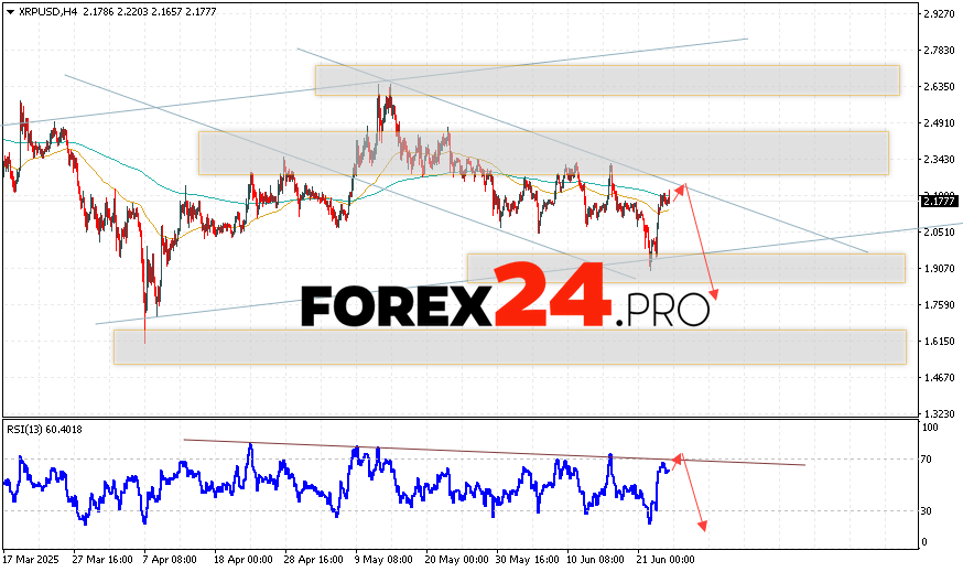 XRP cryptocurrency forecast for June 26, 2025 suggests an attempt to test the resistance level near the 2.1975 area. From there, we can expect the cryptocurrency to continue falling with a potential target at 1.7595. An additional signal in favor of a decline in XRP quotes will be a test of the resistance line on the relative strength indicator. A strong growth and a breakout of the 2.3665 area will cancel the decline scenario. In this case, we can expect the digital currency to continue rising with a target above 2.5505.