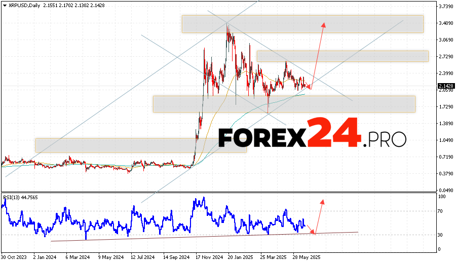 XRP/USD quotes are trading at 2.1428 and continue to move within the framework of the downward trend and bullish channel. Moving averages indicate a short-term bullish trend for XRP. Prices are again testing the area between the signal lines, which indicates pressure from buyers of the asset and a potential continuation of the rise in the XRP exchange rate on the market from current levels. As part of the forecast for XRP for the week of June 23 — 27, 2025 we should expect an attempt at a bearish correction of the asset and a test of the support level near the 2.0705 area. Further, an upward rebound and continued growth of the cryptocurrency to the area above the 3.4005 level.