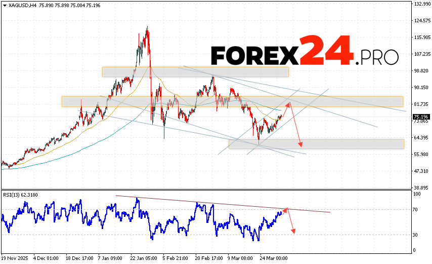 Silver Forecast XAG/USD for April 2, 2026 suggests an attempt to test the resistance area near 78.75. Next, we should expect a price rebound and a continued decline in silver with a target below 62.55. A strong rally and a breakout of 84.05 would cancel out the downward trend in silver. This would indicate a breakout of the resistance area. In this case, we should expect a continued rise in silver with a target of 88.55.