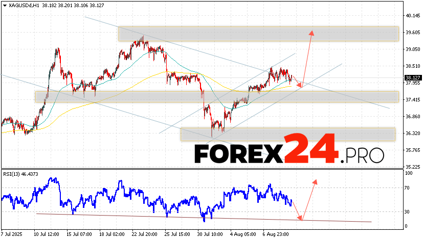 Silver Forecast XAG/USD for August 12, 2025 suggests an attempt to test the support area near the level of 37.65. Further, the quotes will continue to grow with a target above the level of 39.65. The option of increasing Silver prices will be cancelled by a fall and a breakout of the level of 37.25. This will indicate a breakout of the support area. In this case, we should expect the Silver price to continue to decline with a target at the level of 35.35.