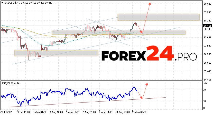 Silver Forecast XAG/USD for August 14, 2025 suggests an attempt to test the support area near the level of 37.75. Further, the continuation of the growth of quotes with a target above the level of 39.85. The option of rising prices for Silver will be cancelled by a fall and a breakout of the level of 37.35. This will indicate a breakout of the support area. In this case, we should expect a continuation of the decline in the price of Silver with a target at the level of 35.75.