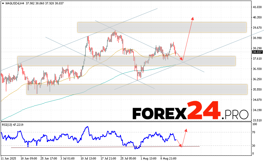 Silver Forecast XAG/USD for August 15, 2025 suggests an attempt to test the support area near the level of 37.65. Further, the quotes will continue to grow with a target above the 40.35 level. A fall and breakout of the 36.75 level will cancel the option of a rise in silver prices. This will indicate a breakout of the support area. In this case, we should expect a continuation of the decline in the price of silver with a target at the 35.25 level.