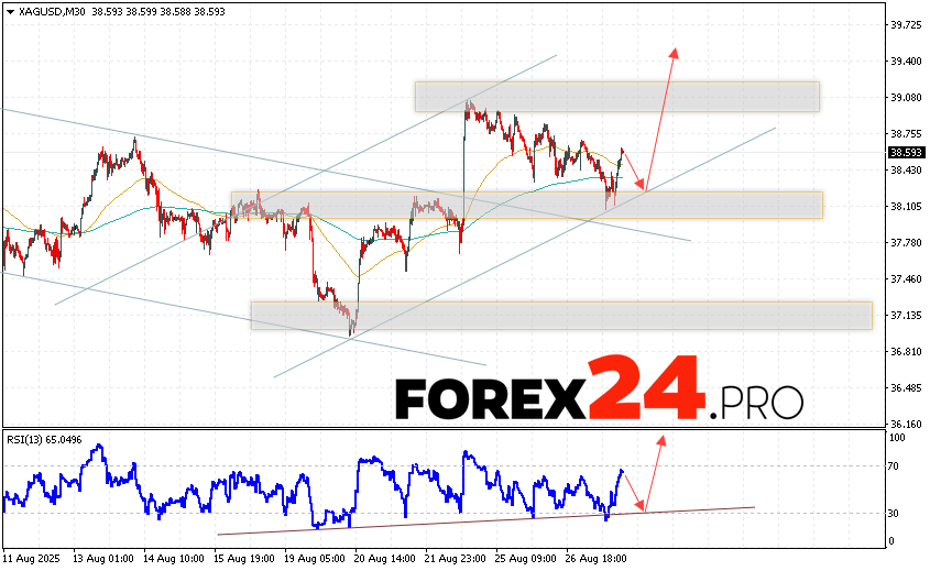 An additional signal in favor of the growth of quotes and prices for Silver XAG/USD will be a test of the support line on the relative strength indicator (RSI). The second signal in favor of a fall will be a rebound from the upper border of the descending channel. Cancellation of the option of growth in prices for Silver on August 28, 2025 will be a fall and a breakout of 37.85. This will indicate a breakout of the support area and a continuation of the fall to the area below the level of 35.65. Expect the acceleration of growth of XAG/USD quotes with a breakout of the support area and consolidation of the price below the level of 39.05.