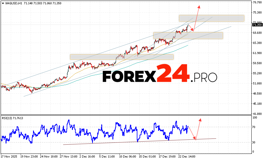 An additional signal of growth in Silver XAG/USD quotes and prices will be a test of the support line on the relative strength indicator (RSI). A second signal of decline will be a rebound from the lower boundary of the bullish channel. A decline and a breakout of 65.45 would cancel the upward price movement for Silver on December 24, 2025. This would indicate a breakout of the support area and a continuation of the decline below 62.25. We expect an acceleration in XAG/USD price growth with a breakout of the resistance area and a consolidation above 72.25.