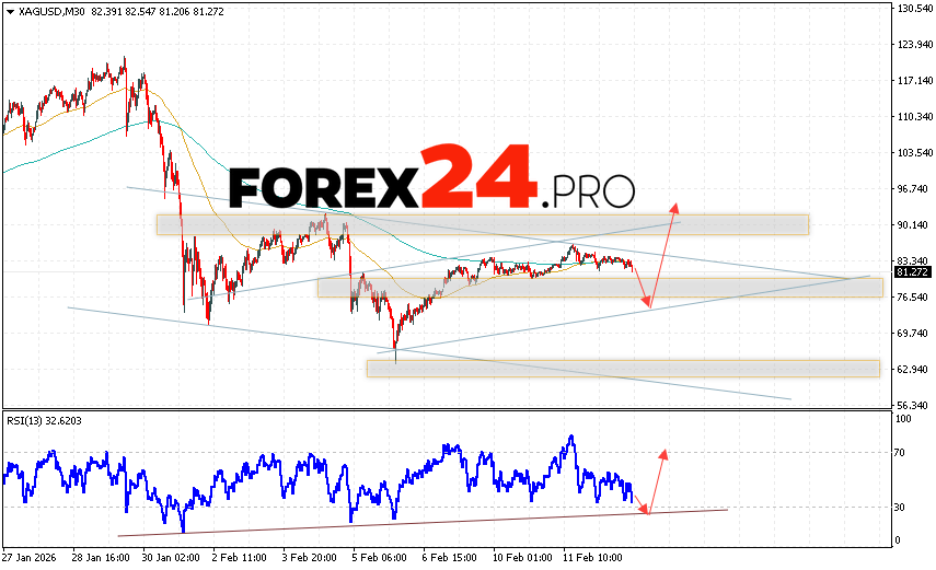 Silver Forecast XAG/USD for February 13, 2026 suggests an attempt to test the support area near 74.05. We should then expect an upward rebound and continued growth in silver with a target above 93.65. A decline in silver prices and a breakout of 69.55 would cancel this upward trend. This would indicate a breakout of the support area. In this case, we should expect a continued decline in silver with a target of 62.65.