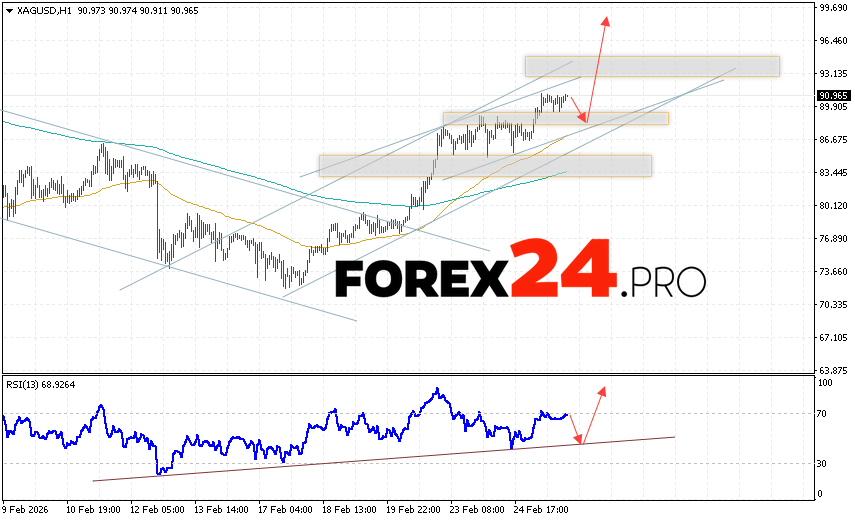 An additional signal favoring an increase in Silver XAG/USD quotes and prices will be a test of the support line on the relative strength indicator (RSI). A second signal favoring a decline will be a rebound from the lower boundary of the bullish channel. A decline and a breakout of 82.05 would cancel out the upward trend in Silver on February 26, 2026. This will indicate a breakout of the support area and a continued decline below 71.65. We should expect an acceleration in XAG/USD price growth with a breakout of the resistance area and a consolidation above 94.05.