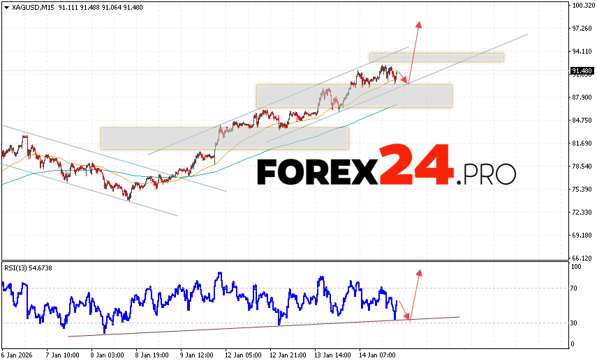 Silver Forecast XAG/USD for January 15, 2026 suggests an attempt to test the support area near 90.45. Further growth with a target above this level is expected, followed by an upward rebound and continued growth in silver with a target above 97.35. A decline and a breakout of 87.25 would cancel out this upward trend in silver prices. This would indicate a breakout of the support area. In this case, we should expect continued decline in silver with a target of 83.25.